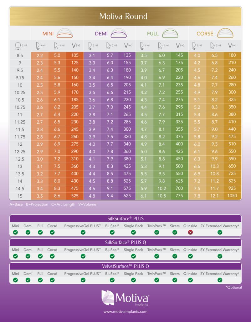 Implantaadi diameeter defineerib dekoltee kuju, implantaadi profiil määrab rinna ülaosa täidluse ja implantaadi maht korvi suuruse.